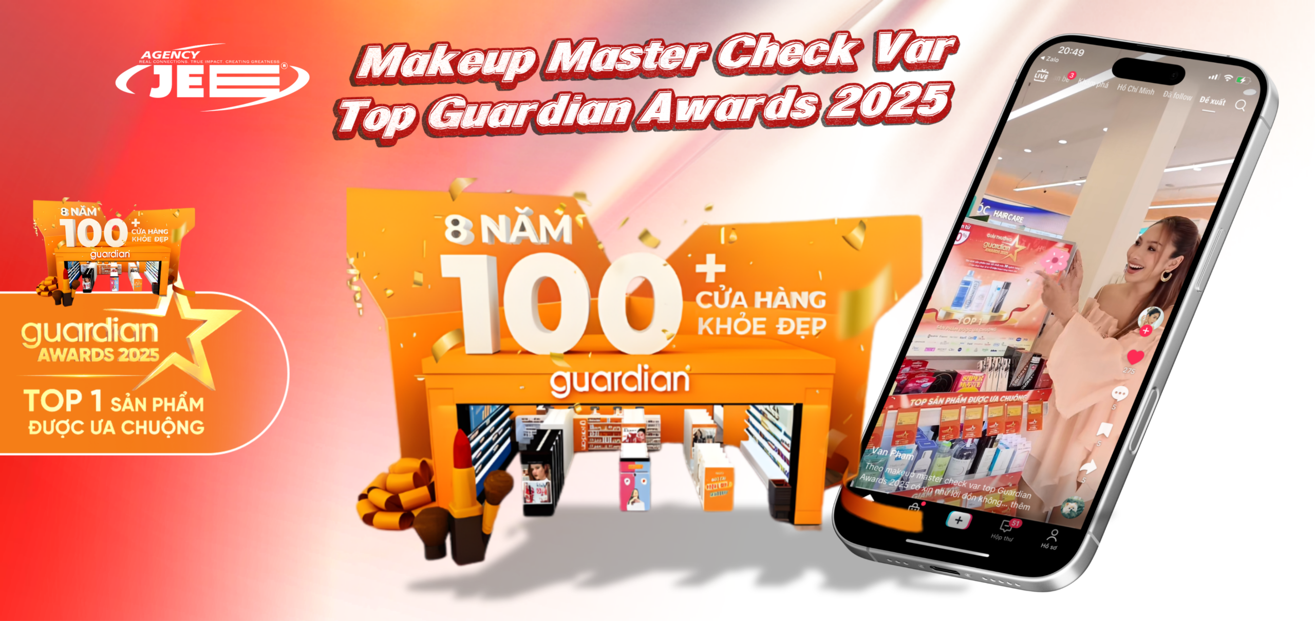 Jee Agency đồng hành cùng Guardian trong chiến dịch “Makeup Master Check Var - Top Guardian Awards 2025” bằng việc kết nối với Vân Phạm và Navi là 2 KOL Beauty có chuyên môn trang điểm và độ uy tín cao trong cộng đồng làm đẹp. Jee trực tiếp tuyển chọn creator phù hợp, xây dựng format nội dung review - test sản phẩm thực tế tại Guardian, đảm bảo thông điệp tôn vinh sản phẩm nổi bật được truyền tải rõ ràng, dễ hiểu và đúng tinh thần chuyên gia. Toàn bộ hành trình từ booking KOL, briefing nội dung đến triển khai được vận hành đồng bộ, giúp Guardian tiếp cận đúng tệp khách hàng yêu làm đẹp và tăng độ tin cậy cho giải thưởng thường niên.
